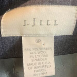 This blue/gray J. Jill blazer is long and fitted with a 3 button hidden closure. It’s a size 6P and made of 53% polyester, 44% wool, 3% Lycra, fully lined. Like new condition! Measurements are as follows: