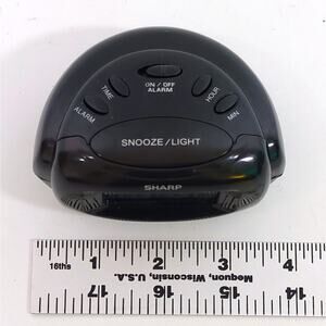 This is a pre-owned, compact Sharp mini digital travel alarm clock in black. It's the perfect size for a nightstand, desk, or for taking on the go.