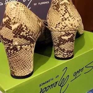 Cool Python Print Pump. Closed Toe Topped with a flat Suede Bow. Manufactured in Florence, Italy.