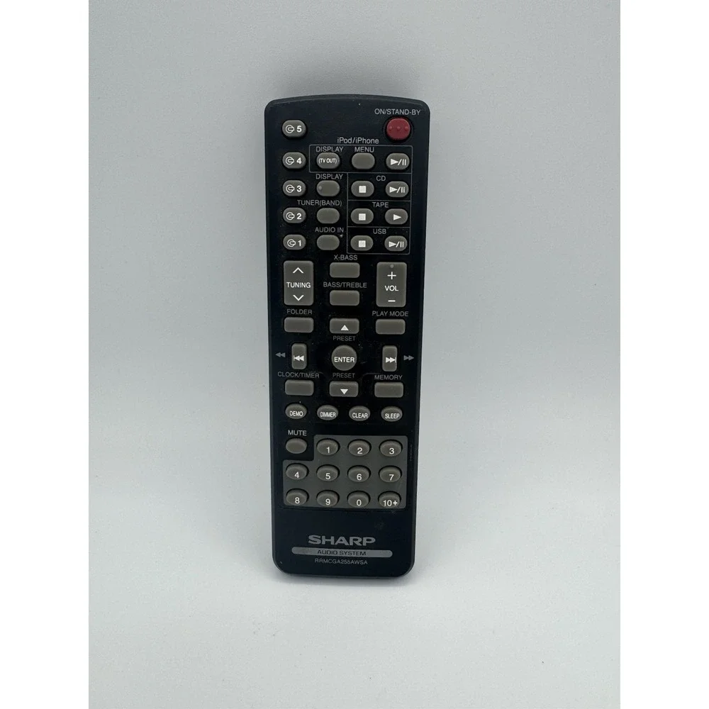 The Sharp RRMCGA255AWSA Audio System Remote Control is a black remote designed specifically for controlling audio systems made by Sharp. This model is user-friendly and allows users to easily adjust settings and features on their audio devices from a convenient distance. With its sleek design and specific compatibility with Sharp audio systems, this remote control is a practical and reliable accessory for enhancing the TV, video, and home audio experience.