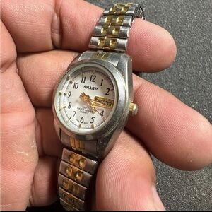 Sharp SHP13 Womens Watch Silver/Gold Tone 25 mm Case Day Date Dial Working with mew battery shows signs of wear such as scratches on case band and crystal as well as some discoloration see pictures for reference