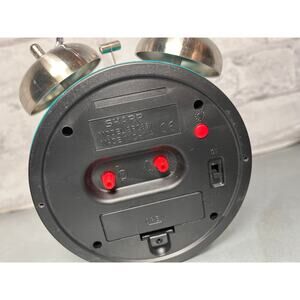 Made by the brand Sharp, two twin bells, battery operated double AA, it’s a turquoise color, alarm clock, it is 7” tall, 4” wide