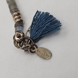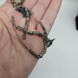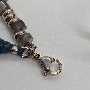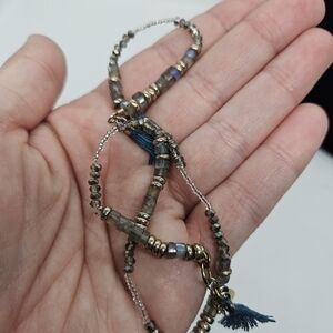 Beautiful strand of labradorite beads along with seed beads in clear, gold, and silver colors. Has a set of teal tassels on the end. Does have a clasp. Clasp shows tone loss, but this is in otherwise good condition.
