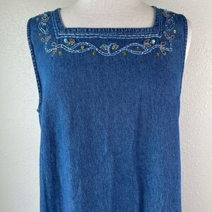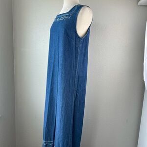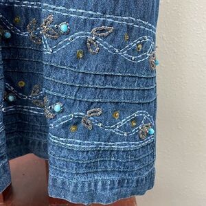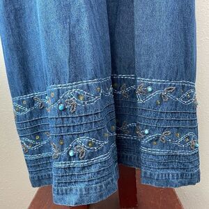 Super cute sleeveless denim maxi skirt by Shaver Lake featuring beaded and stitched embellishments. It measures 20 inches armpit to armpit and 52 inches in length. It’s in excellent preowned condition.