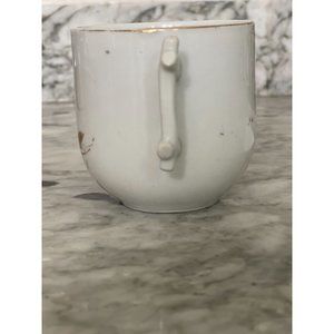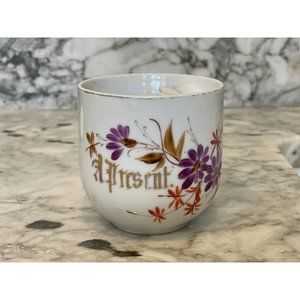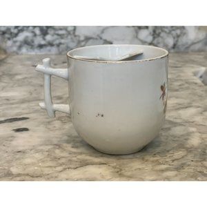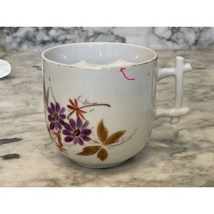 This beautiful shaving mug is a piece of the past. It is marked as "A Present" on the outside of the mug. The approximate dimensions are 3.25"H x 3" D. There is no damage-Vintage Asian-inspired floral shaving mug-gold rim is thin and worn off in areas-flowers and glossy finish are intact. There is a spot on the mug that is from the creation process. It is the same color as the purple flowers. Handle is replicating bamboo shoots. Please review all pictures prior to purchase. Thank you for visiting this lovely piece of nostalgia.