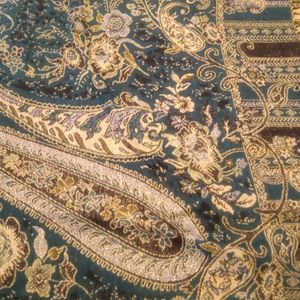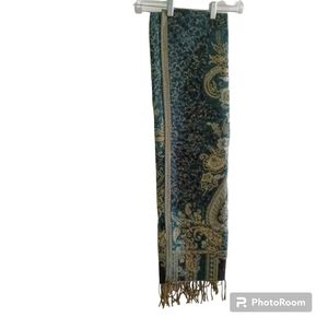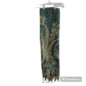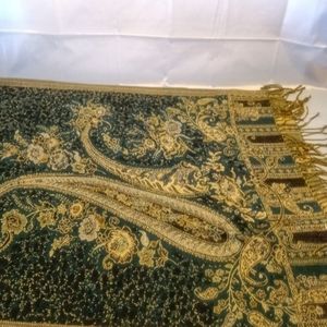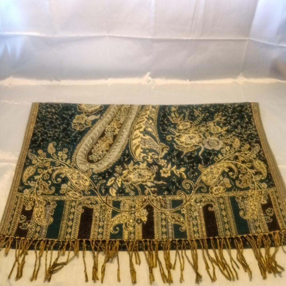 green and gold shawl, approx measurements 69"l x 27"w