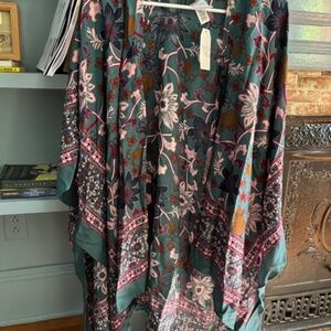 Vibrant shawl/cover up which can be used on top of a dress as an accent or on the beach as a cover up. Very flowy and soft fabric. Very flattering