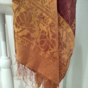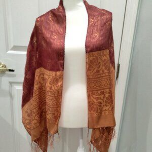 This shawl is stunning in rich rust and gold, with gold threads running through and fringe on each end. It measures 60 inches long and 22 inches wide. Pre-owned, it is in excellent condition. Banarasi refers to a type of fabric, particularly a silk fabric, renowned for its intricate brocade weaving and opulent designs, originating from the city of Varanasi (also known as Banaras) in India. These dupattas are highly valued for their luxurious look and feel, featuring gold and silver zari (metallic threads) and rich colors. They are a symbol of Indian heritage and tradition, often worn during weddings and other special occasions. If you are headed to a dinner party, pair a dupatta with a sophisticated kurti and a simple bottom to look your best self. For those who are into a bohemian look, wearing the shawlas a shrug with the use of a belt, or as a top over a long skirt, is a great option. Dry clean only.