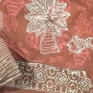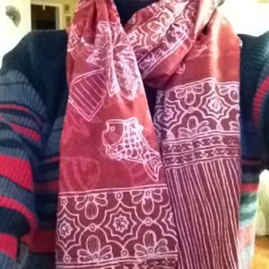 Batik scarf maroon color with palm tree and fish design.