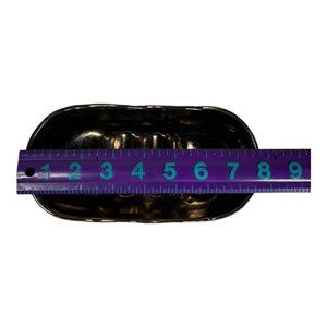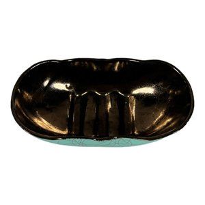 This is a gorgeous mid-century atomic-style dish with a turquoise exterior and copper inside and also a swirl design. Very 1950's. There is a little paint chipping on the edge but it's barely noticeable. No damage overall.