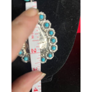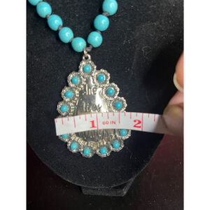 Let your spirit soar with this bold, empowering, and beautifully crafted statement necklace. Featuring 20 turquoise-colored round beads (10 per side) and strung on soft black suede cord, the true centerpiece is a large, ornate silver-tone pendant surrounded by delicate floral engravings and bezel-set turquoise cabochons.