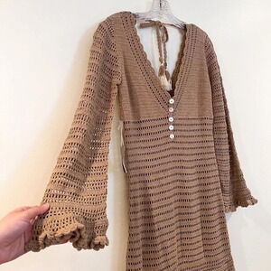 She Made Me Lolita Tan Brown Crochet Knit Beach Cover Up Adjustable Maxi Dress L NWT