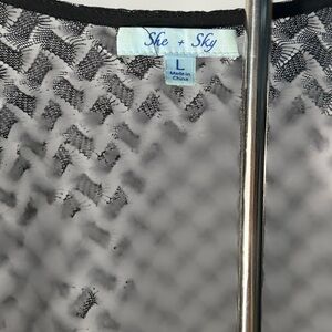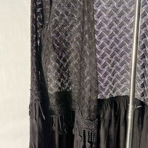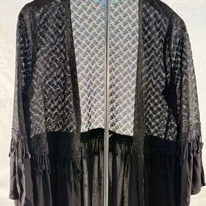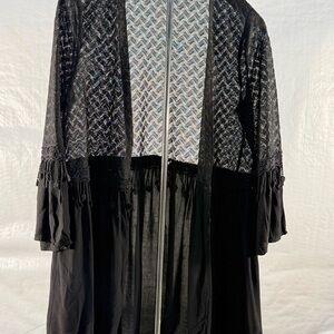 Elegant black jacket with silver patterned detailing. Long sleeves with fringe accents. Perfect for layering.