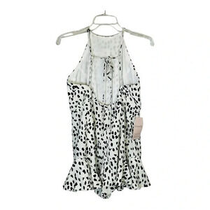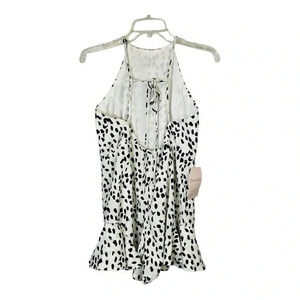 She + Sky Black and White Spotted Romper, halter style top with tie closure on open back, shorts with ruffle hem, super cute and perfect for summer or vacation, women's size large, new with tags.