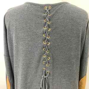 She & Sky Blouse Womens Large Gray Long Sleeve Patch Elbow Split Lace Up Back