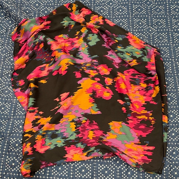 Dynamic abstract fabric with vibrant hues. Features pink, orange, and blue tones.