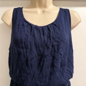 She + Sky navy blue tank dress in size large. This knee-length dress features an open back with two adjustable tie closures for a customizable fit and a gathered, smocked waistband for a flattering shape. The lightweight rayon fabric with polyester lining ensures comfort and easy movement. Excellent condition.