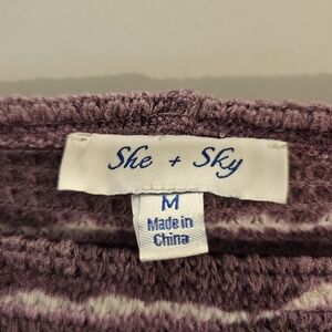 Stylish purple top with white stripes. Features a relaxed fit and long sleeves. Perfect for casual wear.