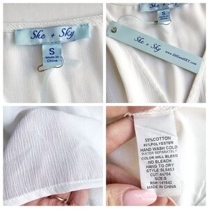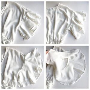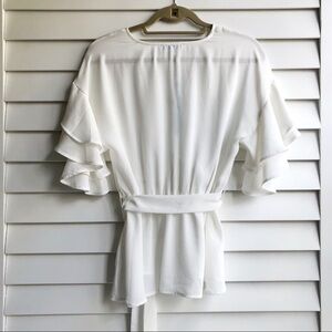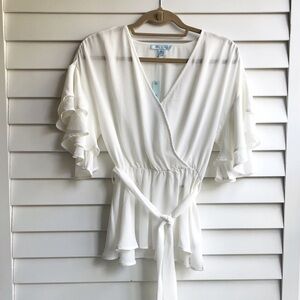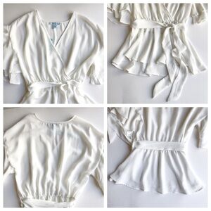 She + Sky Ruffle Wrap Top in white. Double ruffle, short sleeve top has a faux wrap look with a hidden snap at the chest. Top has an elastic waist with a removable self tie belt for a comfortable fit. Pair with denim for an evening out or wear with a dressy pant for work. Fit is true to size. Brand new with tags. Approx. 24” long and 19” across from armpit to armpit.