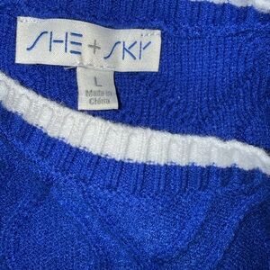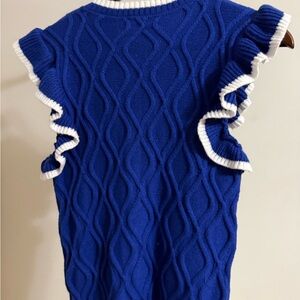 She & Sky blue ruffled sleeveless cable knit sweater Royal blue with white trim on the collar and hem and ruffle cap sleeves