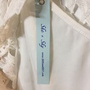 Deliciously cute She and Sky white lace dress with cutout back, invisible zipper. Double button closure at the neck. Great for an informal summer wedding.