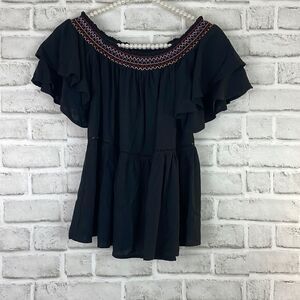She & Sky Off Shoulder Peasant Style Top Black With Embroidered Neckline Small