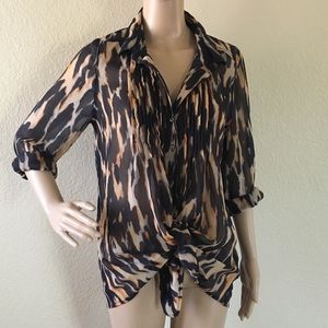Fantastic Buttoned down blouse sheer cheetah style colored print and ruffled/layered trim down the center. Like new! Use it with jeans or tight up with shorts ore skirt even as a bathing suit cover up! Actual item 4 sale pics #4, 8 & 9.