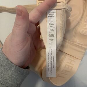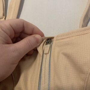 SheFit nude colored Ultimate sports bra with adjustable shoulder straps and adjustable back band. Has high impact support. Front zip with thin material cover over the zipper.