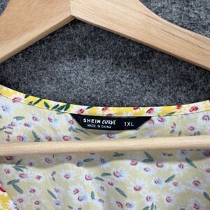 SheIn Blouse Women XL Yellow Floral V-Neck Short Sleeve Button Casual Comfort