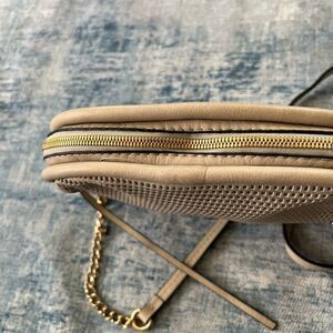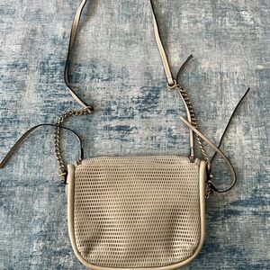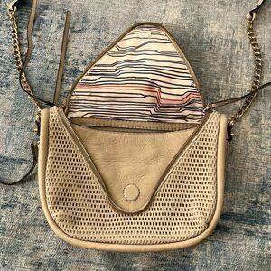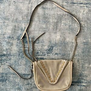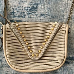 Perforated leather exterior with printed cotton lining. Measures approx 9.5" W x 7.5" H x 3" D. Shoulder strap measures approx 48" with 22" drop. Flap top with magnetic and zipper closure. Gold tone pyramid stud accent. Expandable zippered bottom. Interior slip and zipper pockets.