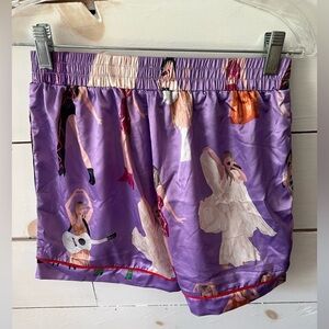 Vibrant silky purple shorts with a unique Taylor Swift Eras graphic print. Features various colorful illustrations. Size small, EUC, smoke free home.
