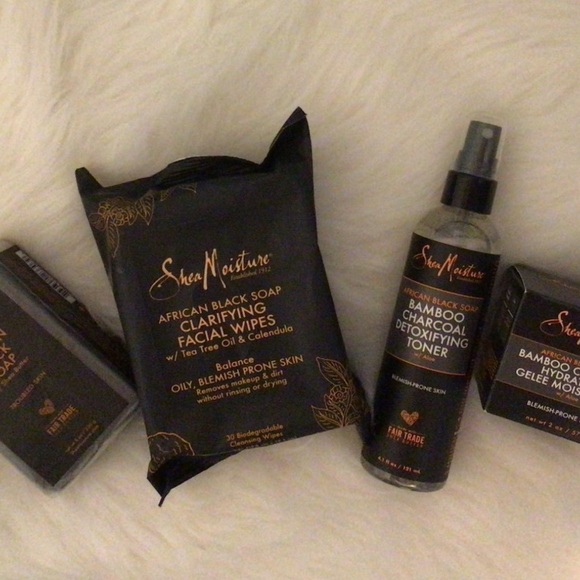 Bamboo charcoal toner, African black soap, clarifying facial wipes, and hydrating Helene moisturizer.