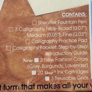 Sheaffer Eaton Calligraphy Box Set, Brand New, Shrink Wrap Intact, Circa 1982. Preowned, shrink wrap intact. This centuries old art form that makes all your writing more distinctive. Kit contains: Fountain Pen, 3 calligraphy nibs-broad (0.07"), medium (0.05"), fine (0.03"), calligraphy practice pad, calligraphy booklet: step by step introductory guide, 3 fashion colors: gray, burgundy, lavender, 20 ink cartridges, 3 reusable grids.