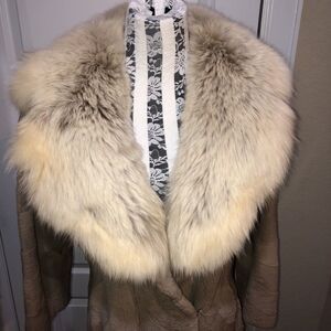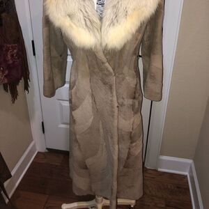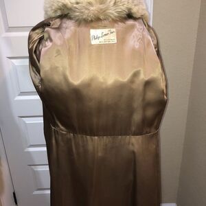 This brown sheared beaver fur with a huge fox fur collar closes via three hook-and-eye fasteners. The beaver fur is connected by a unique design pattern. The interior is a brown-orange polyester material. There are belt loops but no belt. There is a monogram This coat is in good condition and is perfect for colder months. See pictures for more details.