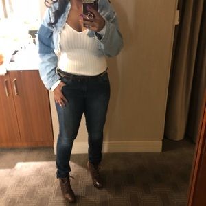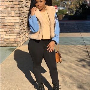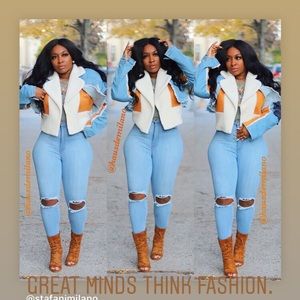 Shearling and denim jacket. Can be worn 3 different ways. This is a MUST HAVE and we only have a few left. Pair the denim jacket with a dress or 2pc for spring