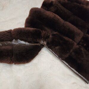 It has two top-access pockets, and two hook/loop for closure in front. Lining and fur are in very good condition. Slight cracking of leather finish where arms meet torso on the underside.