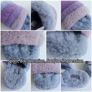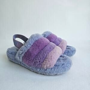 Ugg fluff yeah open toe slides w/ elastic stretch logo slingback strap. Fuzzy furry sheepskin shearling upper in Cornflower Multi colorway: pastel blue and purple ombre stripe. Issues noted in photos. Good preowned condition, overall. Size 7 by UGG. Style: Fluff Yeah. S/N 1097169