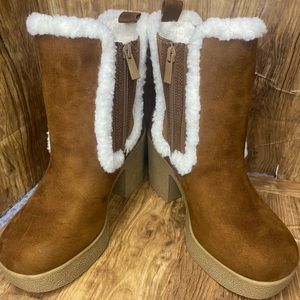 Brand new never worn shearling bootie size 6WW (wide width ) so if u can fit a size 7.5 in regular women these shoes will fit u just perfect as well ! The heel is a 3.5 inches ..