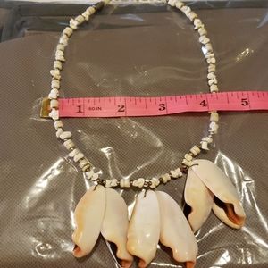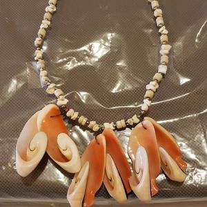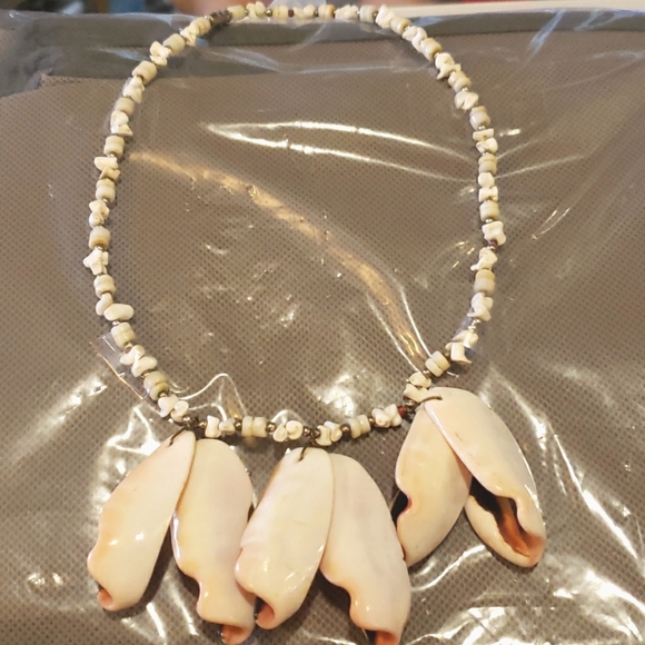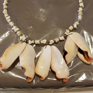 Beaded Seashell necklace. Sea shells are white and pink with black outline.