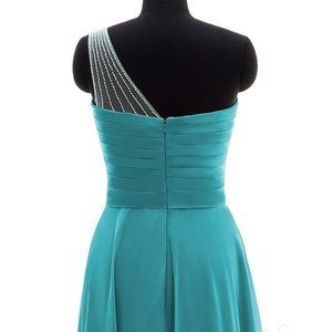 Blue turquoise one shoulder beaded floor length chiffon dress. Brand new with tags and only even tried on once. I bought this to wear for my sisters wedding and she chose something else for me prior to this even arriving. The manufacturer is Cocomelody and it is a size 4. Perfect to wear as a guest to a summer wedding, bridesmaid or formal event. The color is more beautiful in person.