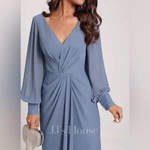 Sheath/Column V-Neck Tea-Length Chiffon Cocktail Dress With Cascading Ruffles #285491 This elegant chiffon dress features a flattering V-neckline and long sleeves, offering a perfect blend of sophistication and grace. The tea-length cut provides a classic, versatile silhouette, while the delicate pleating detail at the bust creates a structured, yet feminine look. The soft, flowing chiffon material adds a light, airy feel to the dress, enhancing its romantic charm. The long sleeves and pleating on the chest add refined detail, making this dress an ideal choice for formal occasions or evening events.
