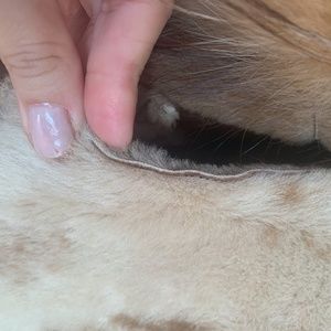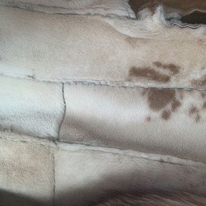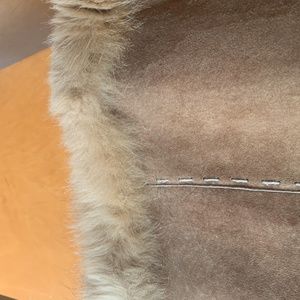 Beautiful, very warm natural sheepskin coat, soft brown suede on the outside, short cut sheepskin on the inside, beautiful and super soft fox fur throughout, button closure, sits at natural waist and slightly flares out, very good condition, some signs of wear at the fur by the sleeves , I bought that coat at a very high end boutique in New York, great quality, it says size small but I am a medium and it fits me well.
