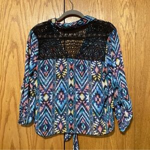 Super cute Aztec sheer button down blouse with a knot tie and black crochet back.