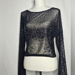 This vintage beaded long sleeve sheer overlay top is perfect for dressing up a basic camisole or over top of a lacey bralette. A great club or party piece. The black, blue and silver Beading over the bust, adds a Starburst effect to an otherwise simple top. The beads catch the light so well and shines with every movement you make.