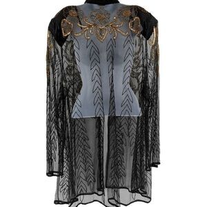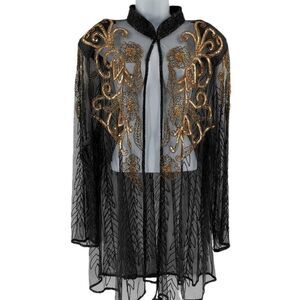 Sheer Black Mesh Duster with Black & Gold Beaded Floral Design | JAISJUMO | Tag Size 2X