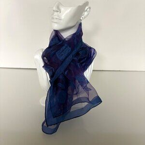 Sheer Blue Floral Scarf Chiffon Embroidered Rose Design Classic Vintage