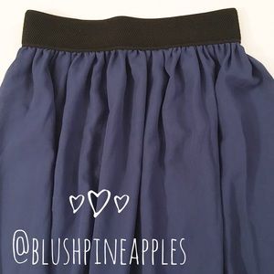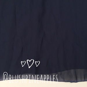 Deep blue in color. Soft and silky feel material. Slip underneath. It is a little long for me because I'm only 4' 11" without heels but it's perfect length for someone slightly taller! I tried real hard to point out the small stains but I can't seem to get the lighting correct.