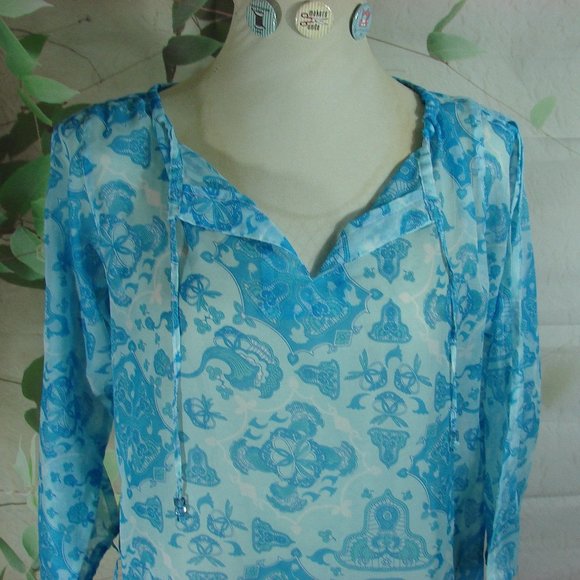 Easy travel piece - rolls up into a sandwich baggie. Ties on neck have beaded ends, ties on sleeve do not. Made in India.