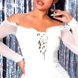 White sheer and ruching make this bodysuit extra sexy. 2 Snaps in crotch area to hold top in place as well as adjustable tie closures in breast area to show off the "ladies"...or not 😉 Wear on or off shoulders.