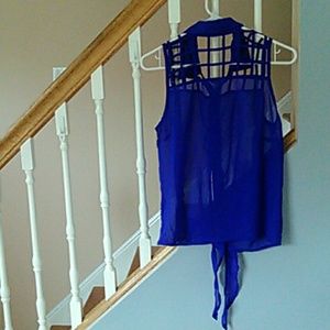 A royal blue button up shirt with a square caged top. This top is sleeveless and has a cute collar to add a touch of sophistication. Very cute by itself and even left open over another top. This shirt also has a tie at the bottom for a flirty summer feel. In great condition!!